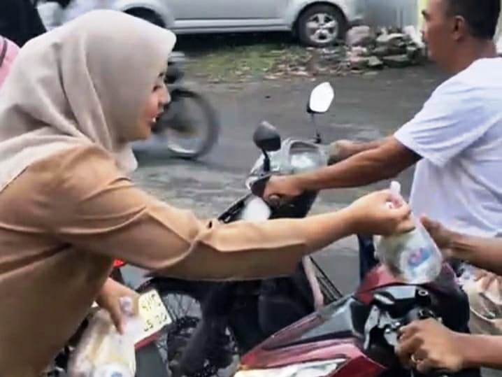 “Terima kasih ya, Nak,” ujar salah satu pengendara sambil tersenyum setelah menerima paket takjil.